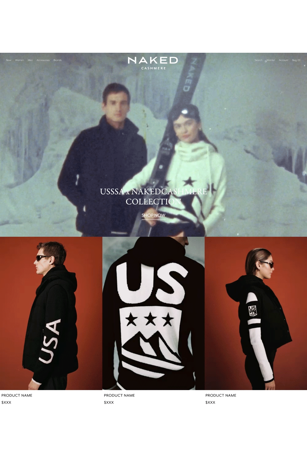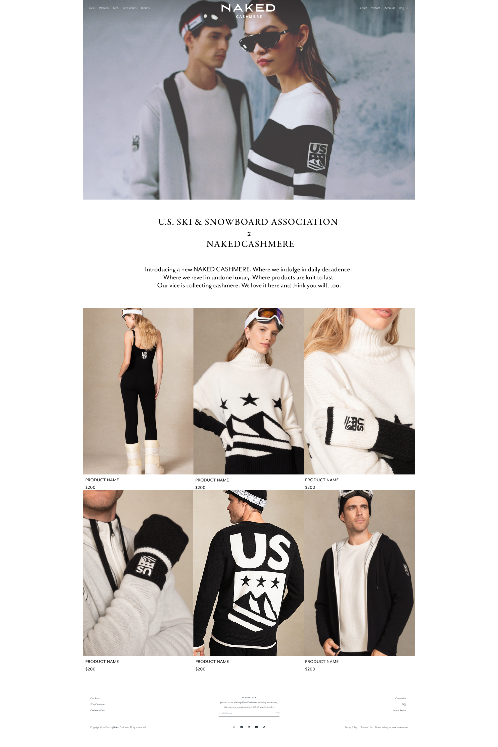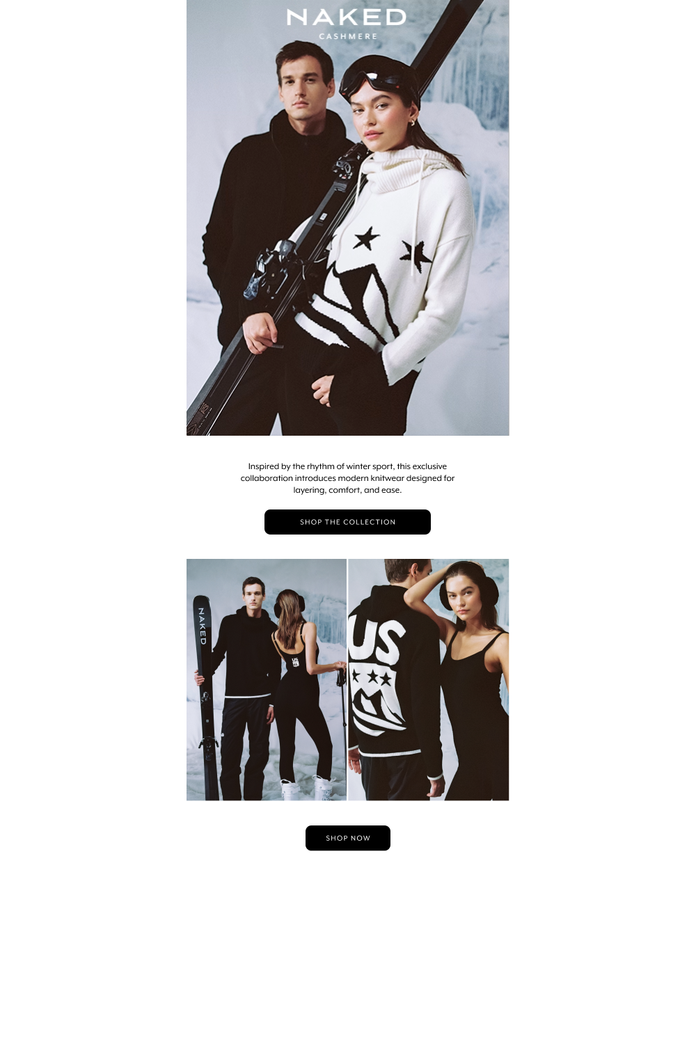 Seasonal capsule campaign created for Naked Cashmere in collaboration with USSS, translating alpine performance inspiration into a luxury lifestyle narrative. Visual execution spanned web, email, and digital content, ensuring a cohesive rollout across all customer touchpoints.