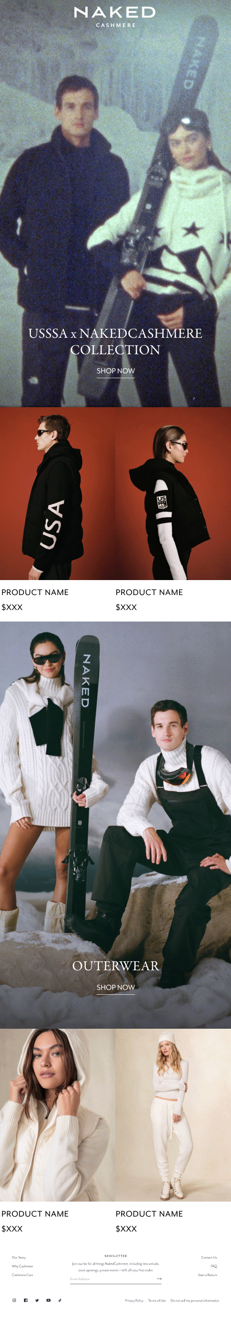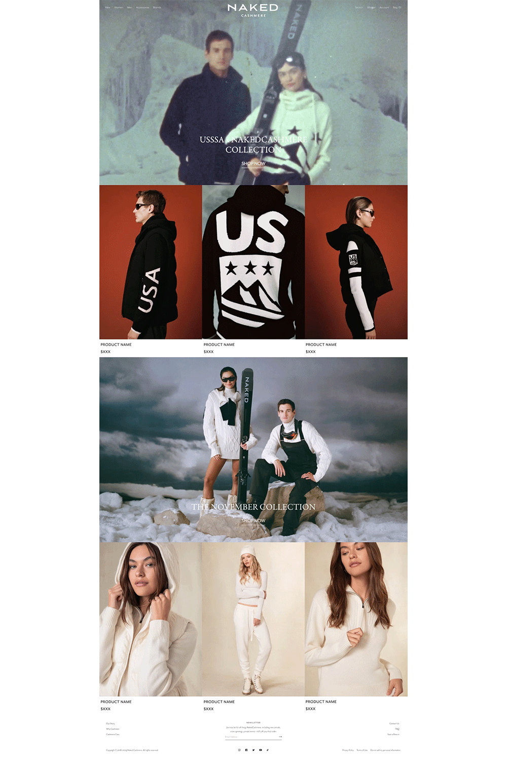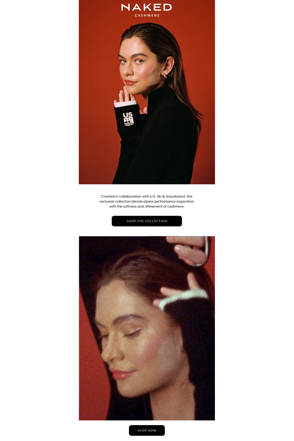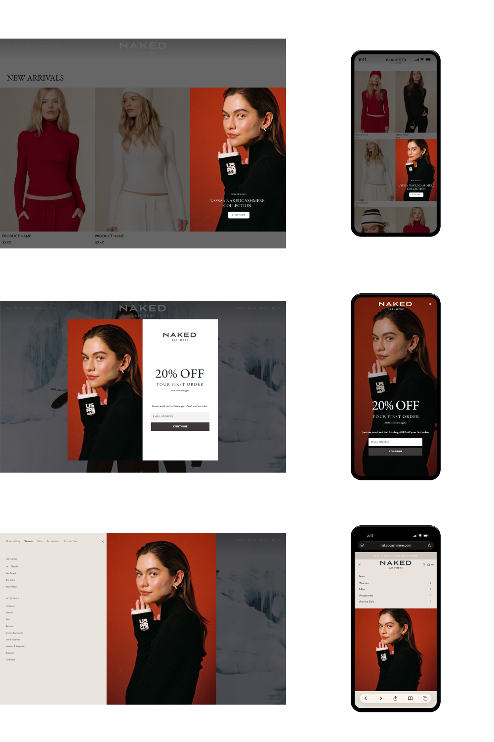 Seasonal capsule campaign created for Naked Cashmere in collaboration with USSS, translating alpine performance inspiration into a luxury lifestyle narrative. Visual execution spanned web, email, and digital content, ensuring a cohesive rollout across all customer touchpoints.